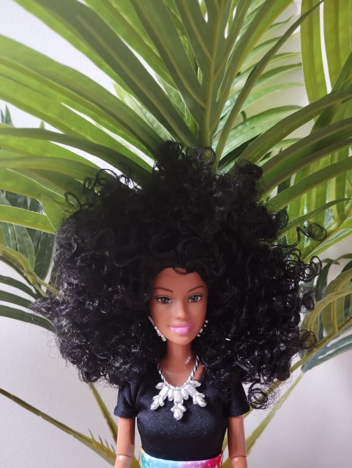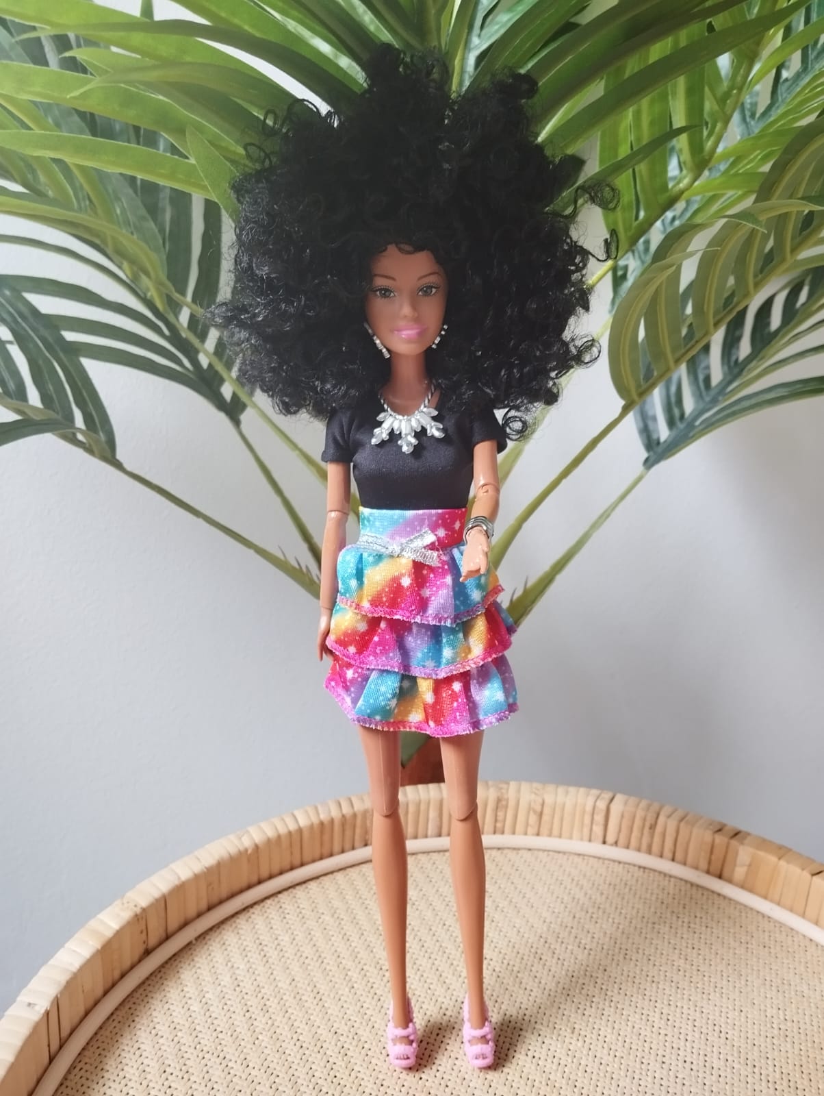 Barbie au teint marron clair de 30 centimètres aux cheveux afro portant une tenue comportant un haut noir, une jupe colorée avec un nœud argenté et des étoiles blanches de la marque l’univers de Nayla Hair.